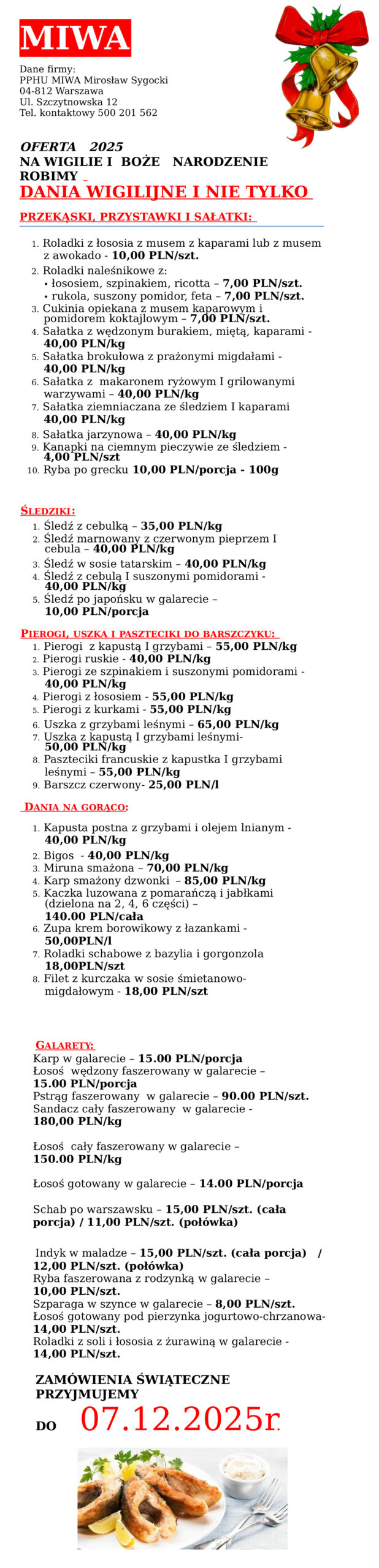 ZUPY: Żur chrzanowy z białą kiełbasą – 35,00 PLN/l Żur na naturalnym zakwasie z białą kiełbasą – 35,00 PLN/l Barszcz czerwony – 25,00 PLN/l + uszka z mięsem – 40,00 PLN/kg lub grzybami – 50,00 PLN/kg Zupa krem brokułowy z grzankami – 35,00 PLN/l GALARETY: Indyk w maladze – 14,00 PLN/szt., połówka 11,00 PLN/szt. […]